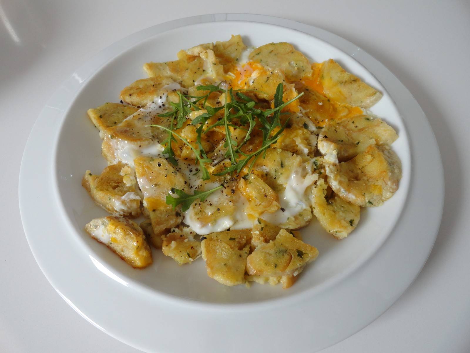 Die gerösteten Knödel mit Ei mit frischer Petersilie oder Schnittlauch bestreuen. Speckwürferl geben dem Gericht eine pikantere Note.