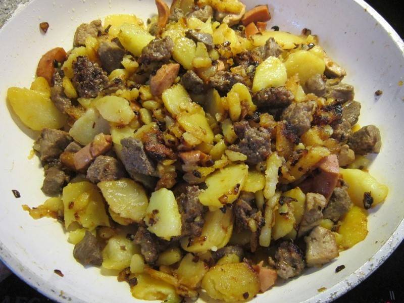 Kartoffeln aus dem Wasser nehmen und von beiden Seiten mit etwas Öl in der Pfanne anbraten. Fleischreste und Schalotten hinzugeben und mit Salz, Pfeffer, Thymian, Majoran und Kümmel abschmecken.