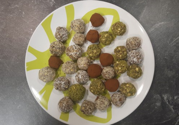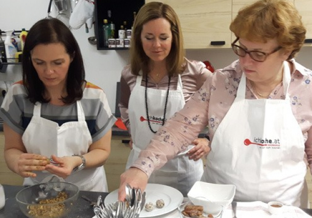 Aus dem Ofen beginnt es bereits zu duften, also Haferflocken in die Schüssel, Sirup dazu, alles verkneten: "Das ist bissl eine patzige Angelegenheit", warnt die Autorin. Kein Problem: Christina rollt, Karin schupft die frisch gewuzelten Glückskugeln gekonnt in Kakao, Kokos und Mandeln.