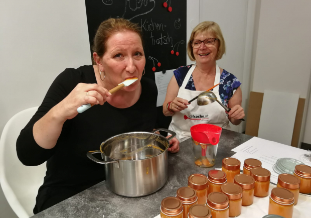 Was bei einem Einkoch-Event natürlich auch nicht fehlen darf: Marmelade! Genauer gesagt: Marillenmarmelade – und das mit ordentlich Schuss! Hier gab nicht nur der Profi Tipps, auch Angelika und Herta berichteten über Ihre Erfahrungen und Tipps beim Marmelade kochen. Nach dem gemeinsamen Abfüllen durfte diese schließlich auch im Backrohr „Platz nehmen“.