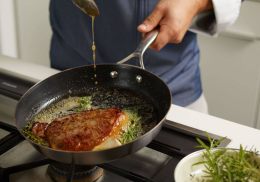 1. Die Pfanne kühlte nicht so schnell aus wie herkömmliche dünne Pfanne. Auch das liegt am Kupfer und dessen Wärmekapazität. Das Steak wurde in der Olavson Pfanne knusprig, statt beim Braten im eigenen Saft zu schwimmen.