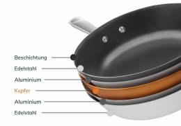 Bei der Pfanne dreht sich alles um das Kupfermaterial, welches das Unternehmen selbst entwickelt hat. Genauer besteht sie aus einem pflegeleichten Mehrschichtmaterial, in dessen Mitte ein dicker Kern aus Kupfer verarbeitet ist.