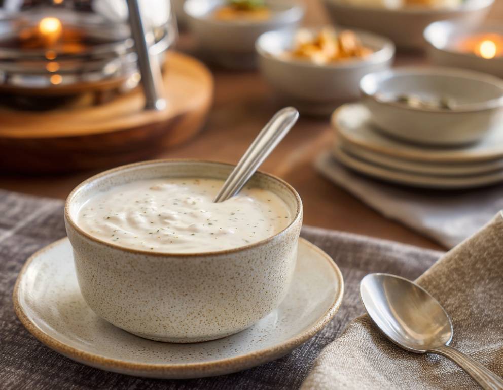 Die Knoblauchsauce passt zum Beispiel zu Gegrilltem, Fondue oder Raclette.
