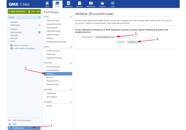ichkoche.atBei GMX wählen Sie in den Einstellungen "Whitelist" aus. Dann geben Sie in das Feld die E-Mail-Adresse newsletter@ichkoche.at ein und klicken auf "Speichern".