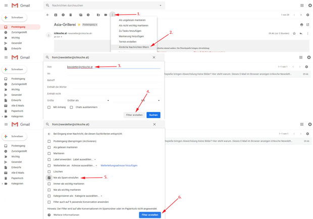 ichkoche.atAuf Gmail können Sie direkt im E-Mail einen Filter erstellen, der die Newsletter von ichkoche.at als vertrauenswürdig einstuft und niemals in den Spam-Ordner schiebt. Dafür die drei Punkte der E-Mail-Einstellungen anklicken und "Ähnliche Nachrichten filtern" wählen. Die E-Mail-Adresse newsletter@ichkoche.at sollte automatisch in die Zeile "Von" geschrieben werden (falls nicht, können Sie diese manuell hineinschreiben). Auf den Button "Filter erstellen" klicken und das Häkchen bei "Nie als Spam einstufen" setzen. Mit dem Button "Filter erstellen" bestätigen.