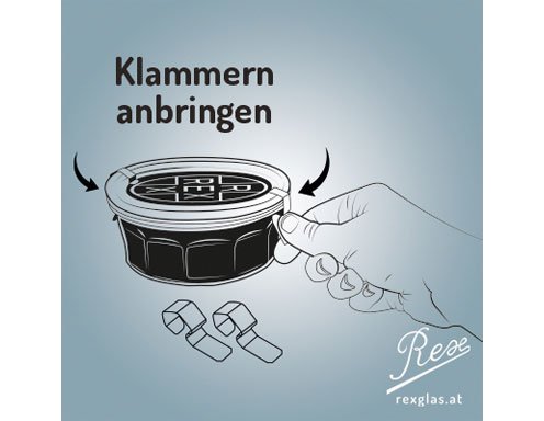 RexVerschließen der gefüllten Einkochgläser mit Federklammern: Das Glas wird mit zwei Rex-Klammern zugespannt, da nur diese aus rostfreiem Edelstahl bestehen und eine gleichbleibende Federkraft besitzen. Die beiden Klammern werden in der Stapelvertiefung des Deckels gegenüberliegend angesetzt und einfach nach unten gedrückt, bis sie unter dem vorstehenden Rand einrasten.