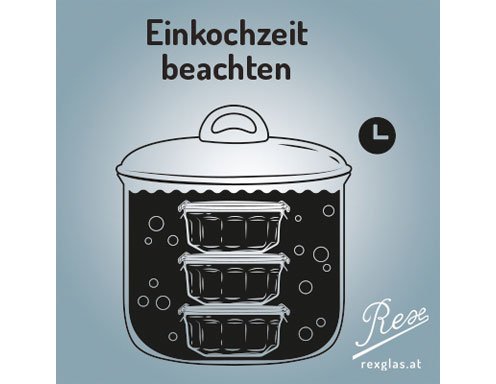 RexBei der Erhitzung der Einkochgläser gilt es, auf die vorgeschriebene Temperatur und Erhitzungszeit zu achten. Die Einkochzeit beginnt, wenn das Thermometer den vorgeschriebenen Hitzegrad erreicht hat. Wenn beispielsweise eine Einkochzeit von 25 Minuten bei 90°C vorgeschrieben ist, so beginnt die Einkochzeit erst dann, wenn das Thermometer 90°C anzeigt.
