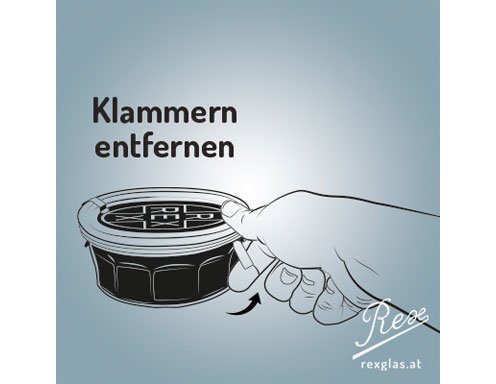 Ist der Einkochring verklebt oder die Anfasszunge abgerissen, lassen sich solche Gläser leicht öffnen, indem man beim Rundrandglas 4 einander gegenüberliegende Klammern aufspannt und das Glas umgedreht für einige Minuten in heißes Wasser stellt.