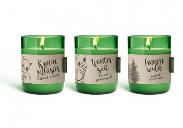 Was die Redaktion besonders liebt: die Kerzen werden in aus Weinflaschen gefertigte Kerzengläser abgefüllt. Nach dem Verbrauch der Kerze, kann man diese mit einem hübschen Eschenholzdeckel mit einem bpa-freien Silikonring versehen und weiterverwenden. Eine herrliche Art, um z.B. trockene Lebensmittel wie Gewürze, Tee, Kaffee oder Nüsse aufzubewahren.